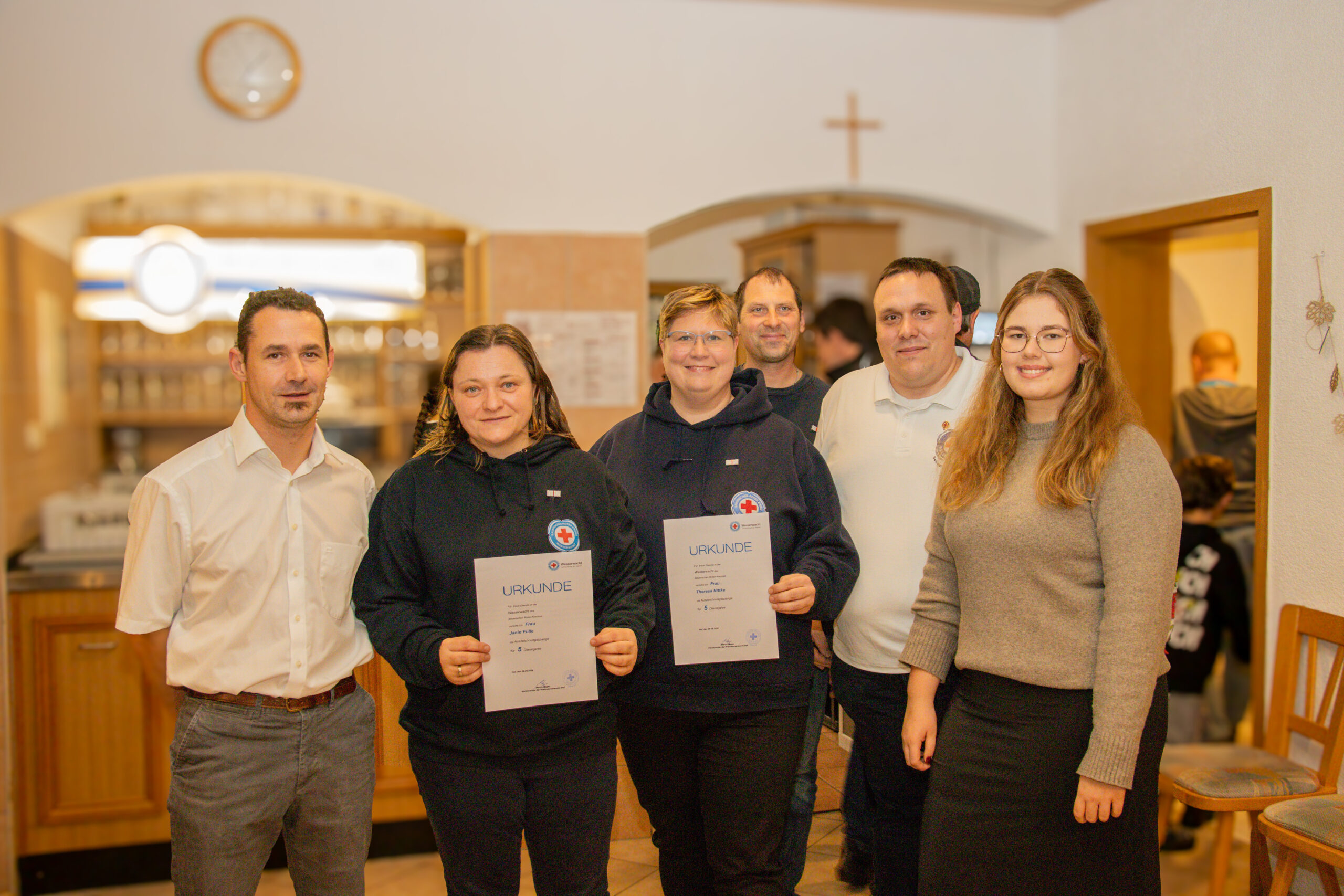 Das Highlight dieser Ehrung war die Übergabe der Auszeichnugsspangen und den Dienstabzeichen für Rainer Hösch und Manuela Fischer, beide haben vielen Generationen an Kindern das Schwimmen beigebracht. Rainer Hösch leistete unzählige ehrenamtliche Stunden; und das schon seit mittlerweile 45 Jahren, nicht nur im Hallenbad, sondern auch auf der Wachhütte ist er immer mit Herzblut dabei. Seit 1981 gehört Manuela Fischer zum Inventar des Hallenbades und ist dort von den Schwimmkursen nicht mehr wegzudenken. Zu diesem Anlass wurde ihr die goldene Ehrennadel des bayerischen Roten Kreuzes verliehen.