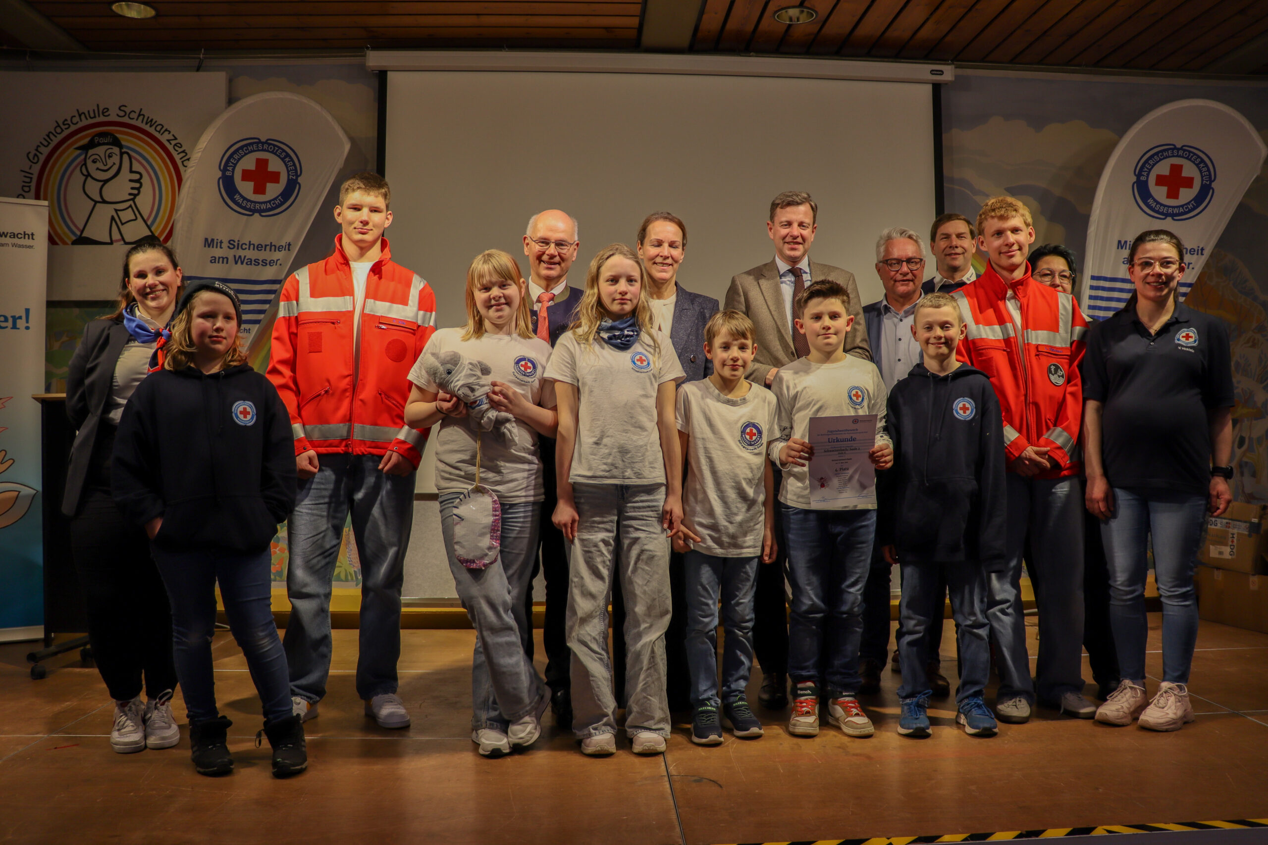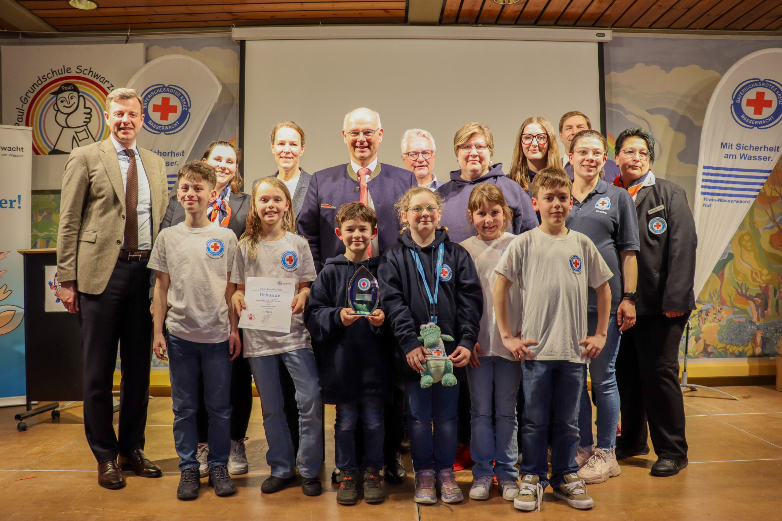 Der Kreiswettbewerb der Kreiswasserwacht Hof wurde in diesem Jahr im Schwarzenbacher Hallenbad und in der Jean-Paul-Grundschule ausgetragen und bot den teilnehmenden Kindern und Jugendlichen ein abwechslungsreiches Programm aus Theorie und Praxis.