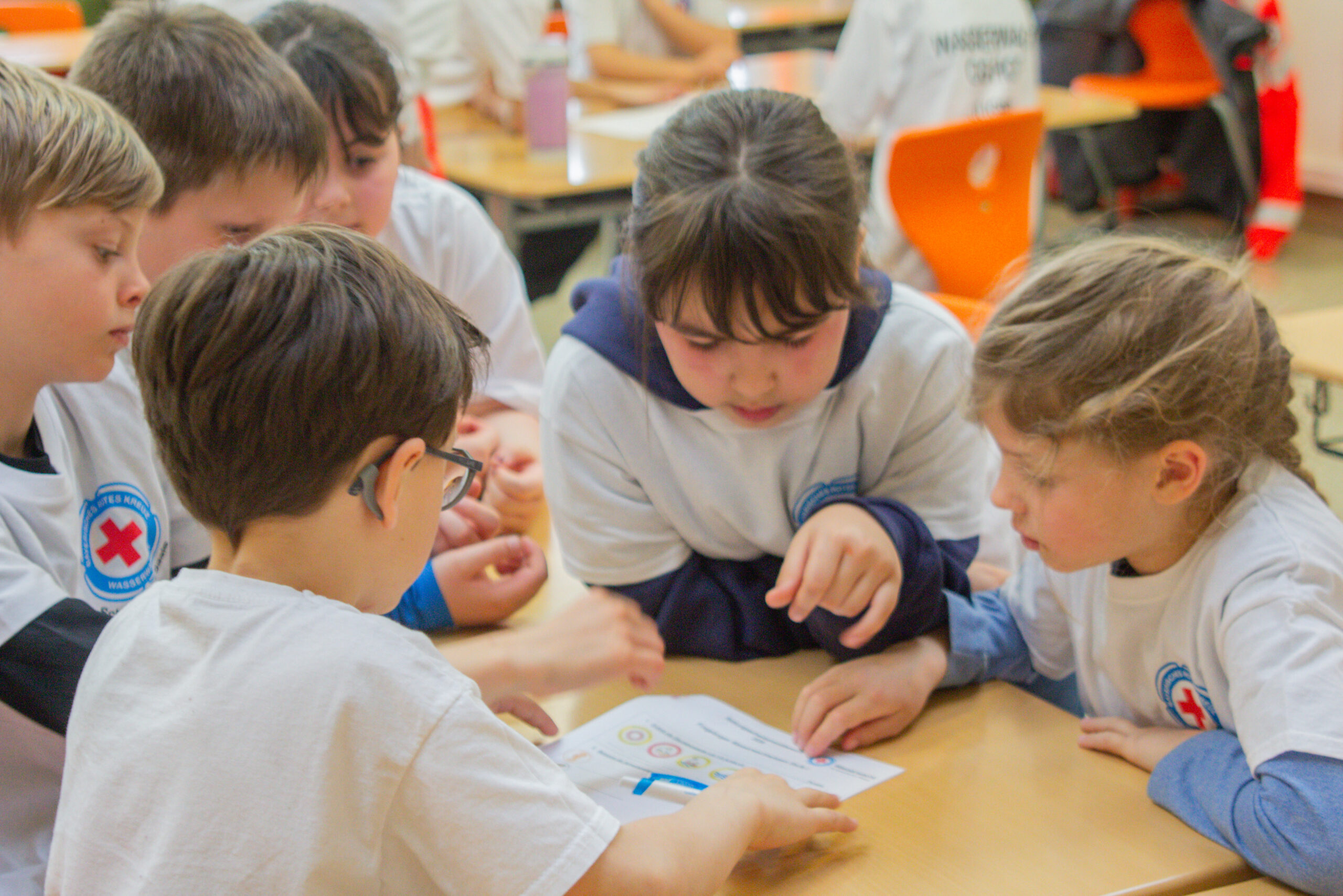 Nach der Mittagspause folgte der praktische Teil der Ersten Hilfe. In unterschiedlichen Szenarien arbeiteten die Teilnehmer gemeinsam an Lösungen und bewiesen ihr Können im Umgang mit Notfallsituationen. Die älteren Gruppen wurden unter anderem mit einer Amputation, einer Gehirnerschütterung und einer Reanimation konfrontiert. Die jüngeren Teilnehmer beschäftigten sich mit Aufgaben wie Vergiftungen, Bauchschmerzen oder der stabilen Seitenlage. Ergänzt wurde dieser Bereich durch Übungen zu einzelnen Erste-Hilfe-Maßnahmen, etwa bei einem Bienenstich, einem Sonnenstich oder bei Fremdkörpern im Auge. Auch die sieben Grundsätze des Roten Kreuzes waren Bestandteil des Wettbewerbs.